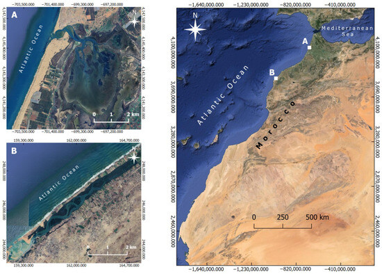 Merja Zerga and Oualidia Lagoons are two semi-enclosed coastal systems (SECS) situated along Morocco’s Atlantic coast (Figure 2). Both sites are recognized as Sites of Biological and Ecological Interest (SIBEs) [66] and Ramsar sites as Wetlands of International Importance.
