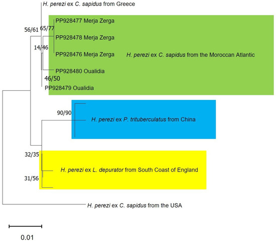 Calculated pairwise uncorrected p-distances from sequences of Hematodinium perezi parasitizing Callinectes sapidus in Morocco and all published sequences of H. perezi obtained from GenBank show that Moroccan sequences are closely similar to that from the host C. sapidus, collected from Greece (A.N., PP056127), and to those from Licocarcinus depurator collected from the South Coast of England (A.N., EF065716, EF065711, EF065708), and differ more from the sequence from C. sapidus collected from the USA (A.N., KX758132). The mean uncorrected p-distances between Moroccan sequences and sequences having an A.N of KX244637, KX244644, or KX244641 from Portunus trituberculatus Miers, 1876 from China is 1.8% (Table 3). According to Small et al. [43], the mean interspecific genetic distances between H. perezi from L. depurator and the Hematodinium sp. infecting P. trituberculatus and Scylla serrata Forskål, 1775 is 2.5% and 4.6% between Hematodinium sp. from C. sapidus and H. perezi from L. depurator. In our study, the mean intraspecific genetic distances between H. perezi from C. sapidus collected from Morocco and all published sequences of H. perezi from GenBank is 1.1%. In comparison with the above-mentioned interspecific distances, this confirms that our sequences belong to parasites that are conspecific with H. perezi.