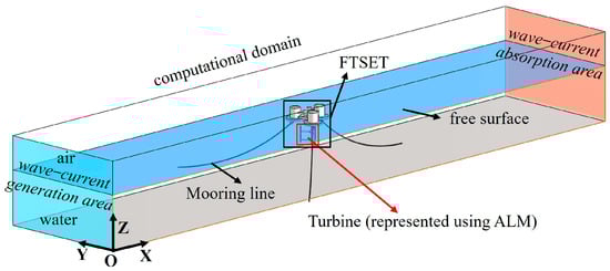 To address the challenges of wave–current interactions, mooring dynamics, and the coupled responses of floating platforms and turbines while conserving computational resources, this study employs OpenFOAM to develop a model capable of nonlinearly interacting with the platform under the combined effects of waves and currents. The model also accounts for the structural dynamics of blade rotations and mooring lines. This improved model, regular wave generation, and uniform water flow are simulated using the olaFlow solver. Hydrodynamic issues of the turbine are addressed with an upgraded unsteady actuator line method (UALM) solver. Mooring dynamics are integrated using the lumped-mass mooring code, MoorDyn, as detailed by Hall and Goupee [29]. By combining olaFlow, UALM, and MoorDyn, this model, referred to as FOAM-FT, accurately and efficiently simulates the entire FTSET system. The effectiveness of the FOAM-FT simulation structure will be confirmed through physical model experiments. The turbine’s performance, platform motion response, and mooring tension loads are validated using experimental results from other studies [12]. Additionally, the formation and interaction of turbine wakes will be thoroughly explored. The manuscript is structured as follows: Section 2 describes the numerical methods, Section 3 outlines the design and validation of the physical model, Section 4 analyzes the wake of turbines under floating conditions and their integration with platform wake fields, and Section 5 presents the conclusions.