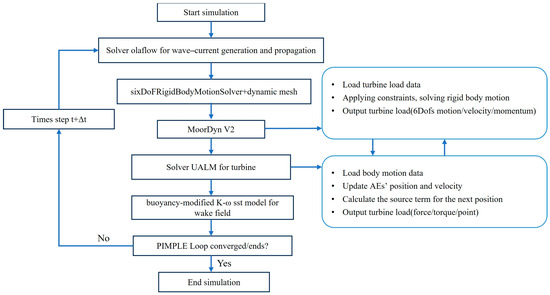 In the source term (Actuator Line Model, ALM) computation step, the turbine’s position and velocity are updated based on the current motion state of the rigid body during each iteration. Resultant loads are then treated as external constraints in subsequent PIMPLE iterations. Each PIMPLE iteration begins by solving the floater’s motion and updating the motion grid. Subsequently, the Volume of Fluid (VOF) function is adjusted to delineate the air–water interface. Pressure–velocity coupling is addressed through a PISO loop, which includes an optional momentum predictor and several pressure corrections.