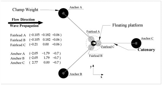 The platform’s motion was monitored in six degrees of freedom using a 6-DoF camera system. A three-point mooring system secured the structure to the inside of the flume, with each mooring line attached to the bottom of the corresponding pontoon. This setup enabled the measurement of the horizontal tension component at each anchor point. Figure 3 illustrates the experimental setup and the mooring line installation positions. In the simulation, the mooring line positions were set based on the experimental conditions. The presence of mooring lines was simulated using the MoorDynV2 mooring toolbox. Each mooring line was four times the length of the water depth. The specific parameters are detailed in Table 2. The parameter setting of the mooring material used in this study can be referenced in Chen’s work [37]. The line internal damping coefficient was set automatically in MoorDyn to achieve a damping ratio of 80% on each segment. Added mass was considered in the transverse direction only, with a coefficient of 1.0, consistent with a cylindrical approximation. Quadratic damping coefficients were set to 1.6 in the transverse direction and 0.05 in the axial direction.