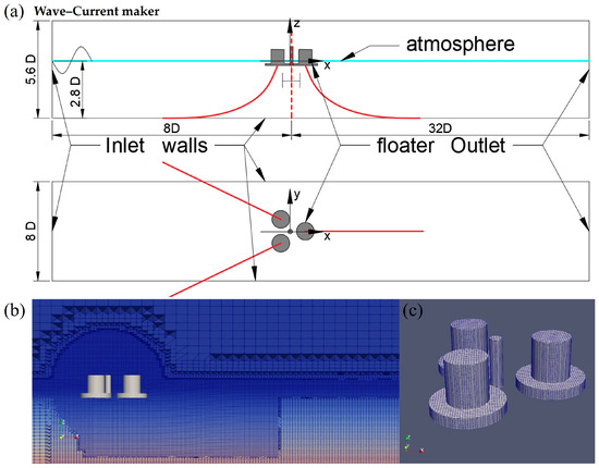 Schematic diagram of the computational domain, (a) computational domain, (b) wake area meshing, (c) floating body meshing.