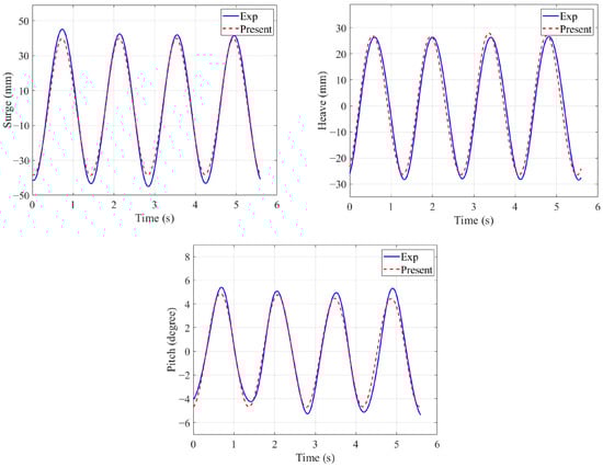 Figure 5 compares the experimental data of three degrees of freedom (surge, heave, pitch) for a single platform under a wave period of 1.4 s and a wave height of 0.06 m. In the figure, “present” denotes the results of the current model, while “Exp” represents the test results. The accuracy of the numerical simulation is verified, as the simulation shows a periodic repetition of the amplitude and frequency of each movement after the initial transient response, closely aligning with the experimental data. The simulation results closely replicate the experimental findings regarding oscillation amplitudes and periods for surge, heave, and pitch motions. The most significant deviation can be observed in the surge motion, where the model slightly underestimated the response amplitude, though it achieved satisfactory agreement in heave and pitch motions.