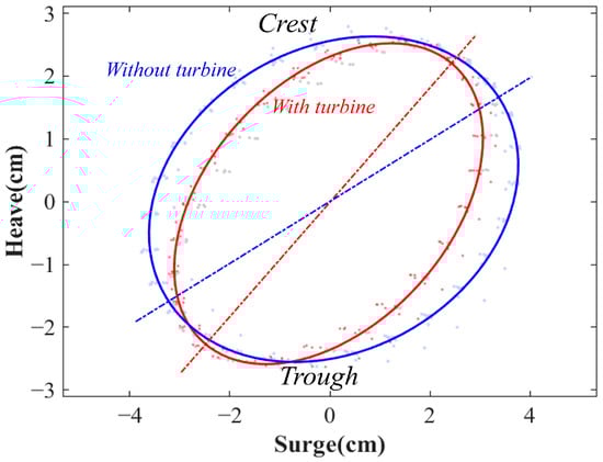 Figure 7 illustrates the dynamic trajectories under wave–current conditions for two scenarios: platform only and platform with an FTSET device. In both cases, the float trajectories take on an elliptical shape. However, the presence of the turbine amplifies the angles and displacements due to turbine rotation. When the turbine is loaded, the tilt angle of the trajectory relative to the x-axis substantially increases, indicating a shift in the structure’s equilibrium position. As a result, the maximum motion amplitudes for heave and pitch are concentrated in the upper right quadrant. Additionally, the ellipse is oriented from southwest to northeast, reflecting the direction of wave and flow propagation. The elliptical trajectory, especially with the floating turbine, is mainly influenced by the waves.