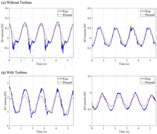 This study critically examines the coupling of mooring dynamics with additional forces induced by the turbine. Figure 8 presents a comparative analysis of tension fluctuations in the mooring lines at the cable attachment point under typical conditions, both with and without the turbine load, through experimental and numerical simulations. To ensure consistency with the experimental setup, the load cell was zeroed in still water. Consequently, the mooring tension value was adjusted by subtracting the pretension in the simulation results, thereby aligning more accurately with the test conditions.
