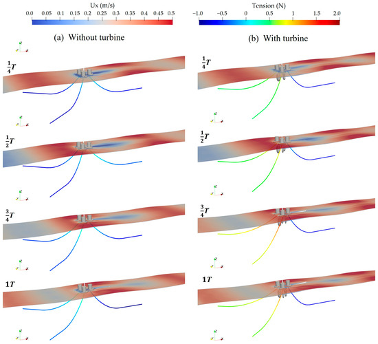 Figure 9 displays snapshots of the instantaneous free surface and mooring lines throughout one incident wave period, under constant wave–current parameters (wave height of 0.06 m and wave period of 1.4 s), both with and without the turbine loaded. The color on the free surface, defined at α = 0.5, represents the horizontal velocity values, while the color on the mooring lines indicates the instantaneous tension along each segment.
