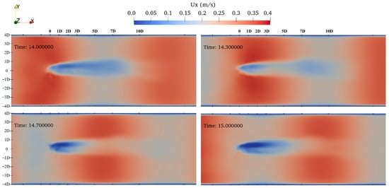 Current coupling models commonly use software such as ANSYS-AQWA [45] and FAST [46] to simulate the motion response of floating structures. However, these models often need to capture the turbulent and disordered flow characteristics typical of natural marine environments. The newly proposed model addresses these limitations. Figure 10 illustrates the development of the turbine wake over a complete incident wave period of 1.4 s, with a wave height of 0.06 m and an average incoming flow velocity of 0.29 m/s, effectively depicting the attenuation induced by the turbine wake. Wave-induced flows led to increased flow velocities at the peak and decreased velocities at the trough, impacting the turbine wake differently than static conditions. The most significant speed reduction occurred approximately 1D to 3D downstream from the turbine, persisting up to 10D. Laterally, the wake diffused significantly, with velocity reductions of up to ±1D. Additionally, velocity superposition effects resulted in a diminished velocity loss when the turbine passed through the crest and an increased loss at the trough. These situations will be further explored in the subsequent quantitative analysis.