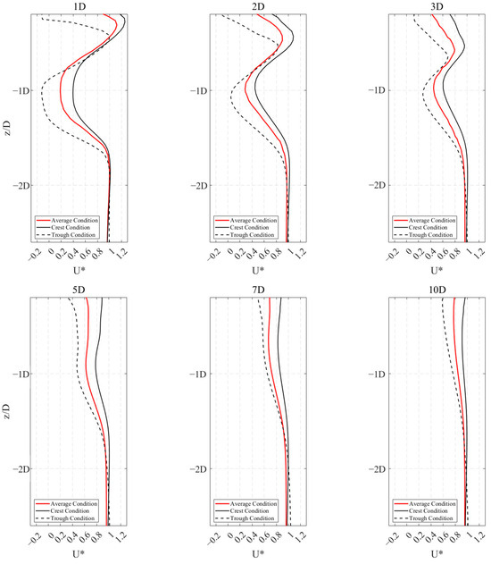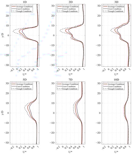To quantify the described phenomena of wake development, Figure 13 presents line diagrams at various lateral distances, using dimensionless parameters in the analysis of xy cross-sections. As the wake passed x/D = 1, the Venturi effect increased the flow velocity between the turbine and the structure, shaping the wake profile into an inverted “S” curve. At this point, the maximum flow velocity occurred at the wave peak, reaching 121% of the maximum flow velocity. As the distance downstream increased, the flow field gradually merged, forming a smooth curve by x/D = 7D. At x/D = 10, the wake distribution stabilized at 95%, 89%, and 60% for peak, average, and trough conditions, respectively.