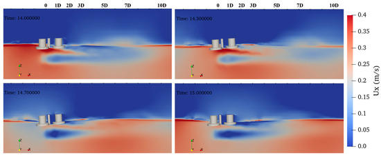 Figure 12 illustrates the wake distribution on the xz plane under conditions of a 0.06 m wave height and a 1.4 s wave period. As floating tidal stream turbines were positioned closer to the water surface than fixed turbines to capitalize on higher surface velocities, it is crucial to consider their interaction with the wake of the floating platform structure. Detailed analysis of the wake distribution throughout the incident wave period reveals significant deviations in the flow field. The wake generated by the impeller gradually merged with the platform wake, causing the free liquid surface to shift. The boundary contour of the wake region exhibited a non-smooth, curved pattern, reflecting the periodic motion of the structure.