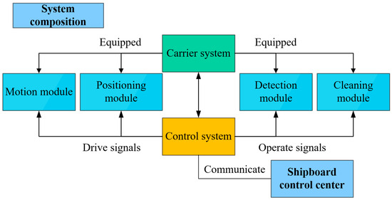 In response to the requirements for underwater detection of jacket piles, as shown in Figure 1, the designed underwater detection robot comprises several modules: the carrier system, control system, motion module, position module, detection module, and cleaning module. The carrier system primarily includes the structural frame and buoyancy blocks to carry all functional modules of the underwater detection robot. The control system controls the drive signals for the robot system, communicating with the shipboard control center. The motion module executes translational and rotational movements according to control signals. The position module utilizes multiple sensors mounted on the robot to locate damage. The underwater detection module, mainly consisting of visual equipment, is tasked with photo capture and automatic identification of structural damage. The cleaning module is equipped with underwater cleaning equipment to clean the wall.