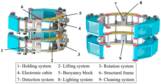 As illustrated in Figure 2, the structural design of the underwater detection robot is composed of a structural frame, a lifting system, a rotation system, a holding system, a detection system, an electronic cabin, and a cleaning system. In detail, the robot consists of two identical structural frames connected by the screw of the lifting system. The detection system, lighting system, and electronic cabin are mounted on the upper structural frame and are responsible for controlling the robot’s underwater detection, movement, and positioning capacities. The cleaning system is installed in the structural frame and tasked with performing cleaning capacity. Moreover, the robot adopts a three-segment structure of mechanical holding mechanism—carrier frame—mechanical holding mechanism, realizing holding motion through the control of the mechanical holding mechanism by electric push rods.