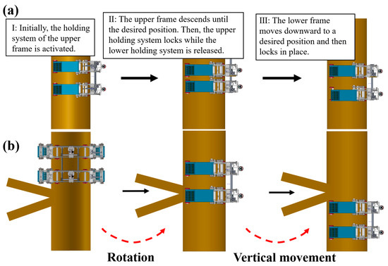 The rotary movement is facilitated by a rotary mechanism that provides tangential force, driving the robot’s wheels to move on the wall of the jacket pile. Furthermore, as illustrated in Figure 4a, for vertical motion, the holding system of the upper frame is first opened. Subsequently, the upper frame descends until it reaches the desired position. Then, the upper holding system locks while the lower holding system is released. Finally, the lower frame moves downward to a predetermined position and locks in place. By repeating the process, the robot can continuously move downward. In contrast, the movement sequences of the upper and lower frames are alternated for upward progression.