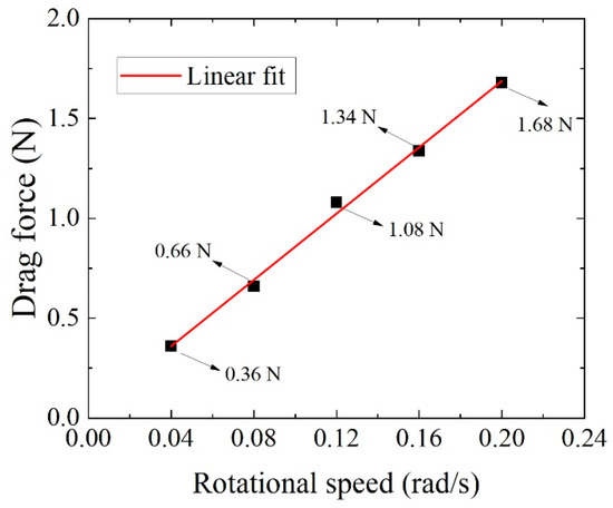 The results indicate a direct proportionality between the drag force on the underwater detection robot and its rotational speed. The highest recorded value is only 1.68 N. This is primarily attributed to the robot’s open-frame structure, which minimizes the contact area with the flow. A linear fit of the drag force against rotational speeds yields the following: