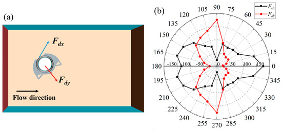The results of the drag force: (a) The drag force is decomposed into radial and tangential components; (b) The drag force on the robot at varying angles of flow.