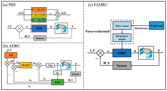 The control structures of the underwater detection robot: (a) PID, (b) ADRC, (c) FADRC.