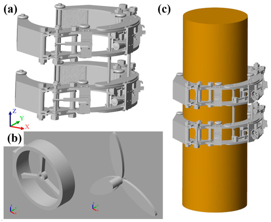 As shown in Figure 3c, there is a propeller mounted on the exterior of the structural frame and four wheels mounted on its interior. The thrust from the propeller pushes the structural frame to rotate along the jacket pile, while the wheels serve to reduce friction and promote propulsive motion stability. The rotation speed of the robot can be controlled by adjusting the propeller’s power.