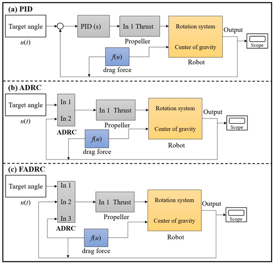Figure 10 shows the PID control model, the ADRC control model, and the FADRC control model, respectively. The main components include target input, algorithm controller, propulsor model, underwater detection robot model, and external disturbances. As shown in Figure 10a, the PID control model receives the target angle as input and produces a control signal u(t), which is used to adjust the thrust of a propeller, in turn affecting the rotation system of the robot. The rotation system is linked to the center of gravity of the robot, suggesting that the control action directly impacts the robot’s orientation. The drag force f(u) exerted by the fluid environment on the robot is also accounted for, affecting the propeller’s effectiveness. The scope is used for the output measurement in the system. Moreover, the ADRC control model is designed to handle both the target angle and drag force more effectively by actively estimating and compensating for disturbances. Similar to the PID system, it produces a thrust that influences the robot’s rotation system and center of gravity. However, it provides more robust control by handling disturbances through a feedback loop. The FADRC is an evolution of the ADRC that takes into account the impact of the drag force even more directly in the control algorithm. The FADRC receives three inputs: the target angle, the drag force, and the measured. This indicates a more complex strategy that factors in the drag force to tailor the control actions more precisely for the environment in which the robot operates.