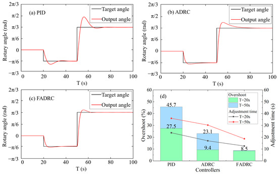 Control Simulation Results: (a) PID; (b) ADRC; (c) FADRC; (d) Comparison of controllers’ performance.