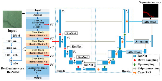 For model training, underwater crack images are input into the encoder, where features within the crack images are extracted via the residual network ResNet50. The network begins with initial pre-processing through zero padding and a combination of convolutional, batch normalization, ReLU, and max pooling layers to extract basic features. It then advances through multiple convolutional and identity blocks, systematically refining and deepening feature extraction to capture more complex patterns. This progression includes mechanisms to prevent information loss and facilitate deeper network training without the vanishing gradient problem. Finally, the network employs average pooling and flattening to condense the extracted features, which are then fully connected for final output generation. Then, these feature maps F1 to F5 are upsampled and concatenated in the decoder to produce new feature maps L1 to L5. Concurrently, feature maps L1, L2, and L3 are fed into the parallel attention module. After processing, L3 is upsampled to match the size of L2, concatenated with L2, and then passed into the attention module associated with the L2 layer. Finally, the output of the last layer, after processing through the attention module, is obtained through a 1 × 1 convolution, yielding a prediction output identical in size to the original image.