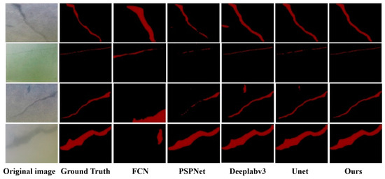 - Furthermore, a novel underwater crack detection algorithm based on the image segmentation network of UNet is developed. The proposed method achieves a mean intersection over union (MIoU) of 84.45%, surpassing UNet and Deeplabv3 by 383.26% and 82.38%, respectively, and showing improvements of 7.43% and 6.3% over FCN and PSPNet, respectively. It also demonstrates the best performance in precision, recall, and F1-score on the test set, achieving 91.46%, 90.63%, and 91.04%, respectively.