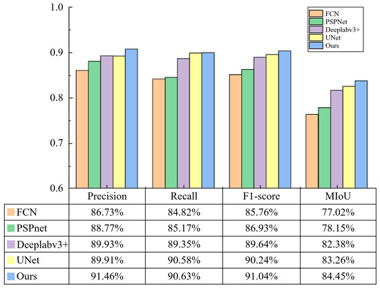 Four metrics of precision—rate of recall, mean intersection over union (MIoU), and F1-score—are employed to evaluate the detection algorithms. The superiority of the proposed algorithms is compared against UNet [43], FCN [51], PSPNet [52], and Deeplabv3 [53] algorithms. The results of different algorithms are shown in Figure 14. All algorithms indicate superior segmentation characteristics when underwater images are clear. Nevertheless, when cracks are too slender or the contrast between cracks and background is low, FCN and PSPNet results are notably inferior, with a significant loss of crack features. Deeplabv3 and UNet perform better than other algorithms but still have issues such as missing crack features, discontinuous prediction pixels, and over-segmentation. Compared to these methods, the proposed algorithm achieves smoother crack segmentation and suggests more closely matching the manually annotated results. A quantitative comparison using the four metrics of MIoU, precision, recall, and F1-score of the different algorithms is shown in Figure 15. The developed method outperformed others in all four metrics, achieving an MIoU of 84.45%, which is higher than both UNet and Deeplabv3’s 83.26% and 82.38%, respectively, and significantly surpassing FCN and PSPNet by 7.43% and 6.3%. It also scored the highest in precision, recall, and F1-score, reaching 91.46%, 90.63%, and 91.04%, respectively.