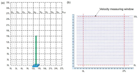 Mapping region for capturing a velocity profile: (a) 10 locations (0 L–27 L) vertically divided and 12 locations (0 L–33 L) horizontally divided, where L = 10.765 mm, and (b) window (~290 mm × 355 mm) for measuring water velocity, showing the instantaneous velocity vector field obtained from the PIV measurement.