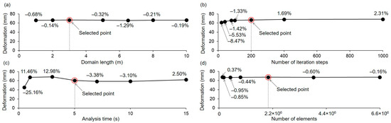 Independence tests for (a) domain length, (b) number of iteration steps, (c) analysis time, and (d) number of elements. Here, the relative % errors are with respect to the selected point; those errors, by definition, must all be positive; however, the “–” sign was intentionally added to highlight the differences with respect to the reference values.