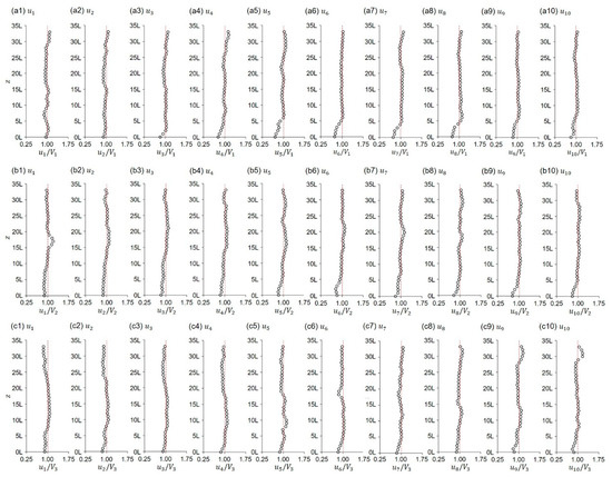 Figure 5(a1–a10) show ten local velocity distributions at an inlet velocity of 0.089 m s−1 measured at ten vertical lines (Figure 2a). The horizontal axis indicates the normalized velocity , which is the ratio of each local velocity at the vertical line to the inlet velocity . Here, ranges from 1 to 10 and from 1 to 3 (e.g., = 0.089 m s−1). The vertical axis indicates the vertical location from 0 to 33 L (Figure 2a). Similarly, Figure 5(b1–b10,c1–c10) show the velocity profiles for = 0.123 m s−1 and = 0.155 m s−1, respectively. In each figure, the velocity near the boundary (the bottom of the flume) is smaller than elsewhere because of friction between the water flow and the bottom of the flume.