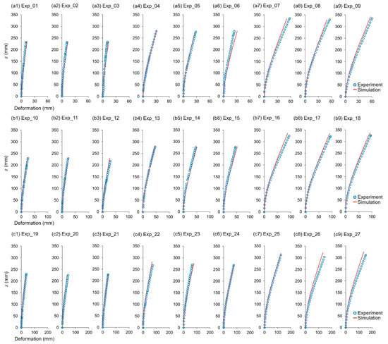 Single vegetation deformation estimated by the PIV experiment and FSI simulation in case of the velocity of 0.089 m s−1 (the first row; (a1–a9)), 0.123 m s−1 (the second row; (b1–b9)), or 0.155 m s−1 (the third row; (c1–c9)). Each estimation was based on the single vegetation indicated by Exp_01 to Exp_27 (Table 4). The vegetation heights of the first three (i.e., (a1–a3), (b1–b3), or (c1–c3)), the next three (i.e., (a4–a6), (b4–b6), or (c4–c6)), and the last three (i.e., (a7–a9), (b7–b9), or (c7–c9)) were 250, 300, 350 mm, respectively (to be continued).