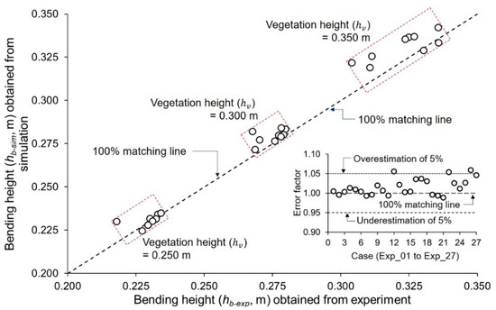 Table 4 also shows the simulation results (the bending heights) of the 27 cases. Each bending height was less than the vegetation height, i.e., 90.00–97.71% of the latter heights. To compare the simulated and experimental figures, both results (the horizontal vegetation deformations along the -axis) are plotted in Figure 6(a1–a9) for the inlet velocity = 0.089 m s−1. Similarly, Figure 6(b1–b9,c1–c9) compare the results for = 0.123 m s−1 and = 0.155 m s−1, respectively. To evaluate the accuracy of the simulation, we compared the bending heights () of the experimental and simulated results (Figure 7). The 100% matching line indicates 100% agreement. In the figure, most points are close to the line, and the dispersion increases as the vegetation height rises.