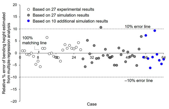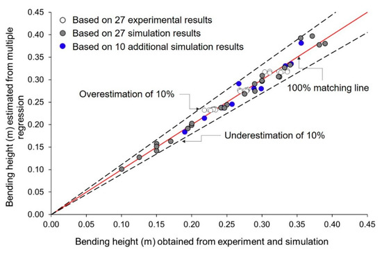 In Figure 8, the white and gray circles are the bending heights from multiple regression analysis of the 27 experimental data (Table 4) and 27 simulation data (Table 5), respectively. Most circles are within the 10% overestimation and underestimation lines and thus close to the 100% matching line; the multiple regression results were in good agreement with the experimental and simulation results. To further verify the accuracy of the regression analysis, the FSI simulation and multiple regression equation were used to calculate the bending heights for a further ten cases (blue circles in Figure 8). All blue circles are within the 10% lines and thus close to the 100% matching line, further validating the accuracy of the regression analysis.