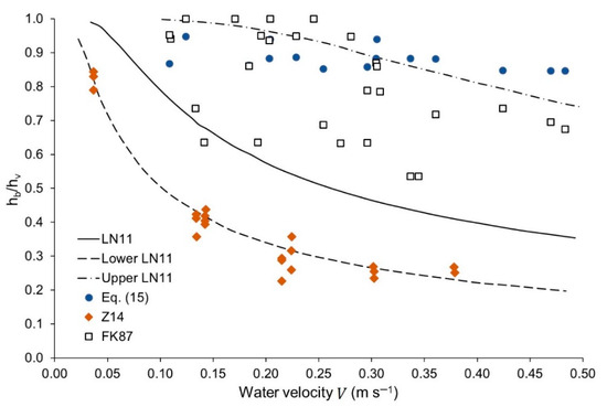 Comparisons of the ratio () between the present study (regression equation; Equation (15)) and other studies (theoretical data (LN11); experimental data (Z14 and FK87)).