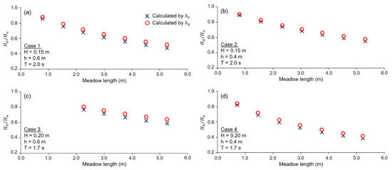 Figure 11 shows the ratios of downstream wave heights and upstream wave heights () obtained in this study; the corresponding meadow lengths are 0.79–5.26 m for case 1, 0.80–5.32 m for case 2, 2.27–5.26 m for case 3, and 0.72–5.23 m for case 4. From the figure, we can observe that the ratios calculated by appear larger than those calculated by for the four cases. This indicates that the wave height is reduced less when bending behavior is taken into account. This is because the bending behavior of vegetation reduces the frontal area, consequently reducing the energy lost in a wave travelling over vegetation [34,57]. Therefore, calculating the wave height from the bending height decreases the wave height reduction compared with calculating it from the vegetation height. As the experiment of Losada et al. [31] pointed out, vegetation stems bend in the flow direction; hence, utilizing the bending height for wave height calculation reflects the actual motion of the vegetation stem, unlike when using the vegetation height.