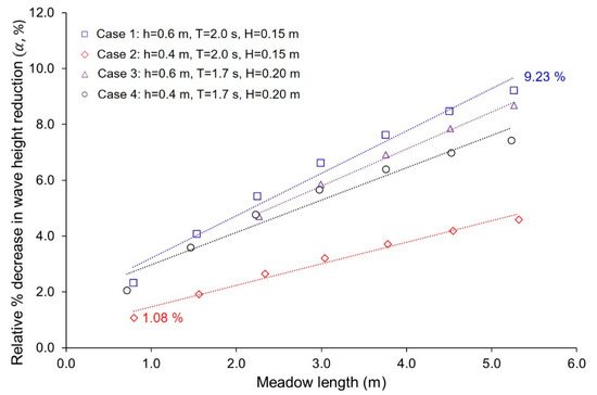 As the vegetation meadow increases, the relative % decrease in wave height reduction () increases linearly, up to ~10% (9.23%) in the selected case studies (Figure 12). This implies that the impact of bending behavior becomes more pronounced with a larger vegetation meadow. In the figure, is greater when the water depth is 0.60 m compared to 0.40 m. Considering the vegetation height of 0.588 m in our calculation, this indicates that the vegetation is fully submerged at a water depth of 0.60 m but partially submerged at 0.40 m; hence, is greater in a fully submerged vegetation meadow than in a partially submerged vegetation meadow. In a fully submerged meadow, the current acts along the entire stem height, resulting in greater deformation or a smaller bending height.