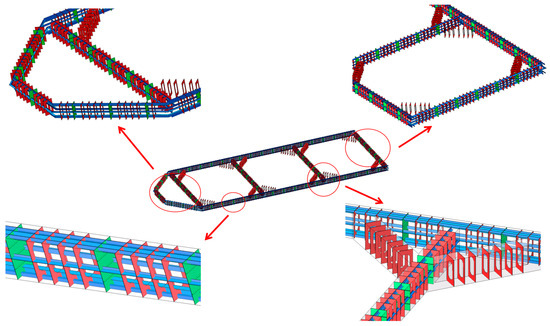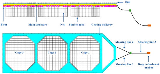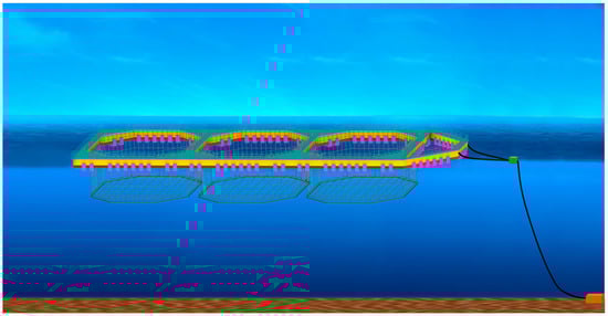 According to the design method and principle of Section 3, the designed schematic of the innovative deep-sea aquaculture platform is illustrated in Figure 7. The primary structure consists of a steel framework integrated with HDPE floats. The design accommodates three aquaculture cages arranged sequentially on the platform, with adjacent cages sharing a steel cross-brace to enhance structural integrity. Diagonal braces within each cage serve to consolidate multiple cages on a single platform, facilitating integrated, large-scale, and automated deep-sea aquaculture operations. The platform also features an upper grating walkway to facilitate routine operations by aquaculture personnel and to allow the installation of supplementary equipment, such as lifting gear. Safety rails are installed on both sides of the walkway to ensure the safety of personnel during operations.
