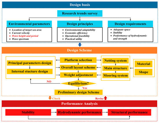 This process includes a comparative evaluation of existing aquaculture platforms to guide the selection and dimensional scaling based on specific design requirements. Meanwhile, it formulates the designs for the net and mooring systems of the platform. In addition, it takes into account the safety of aquaculture personnel during routine operations. Such a process produces a preliminary overall parameter configuration of the platform. Following the initial setup, the weight and center of gravity of the platform are iteratively adjusted to satisfy stability requirements. The hydrodynamic and structural performance are analyzed based on the marine environmental conditions at the location of the platform. Should these analyses reveal deficiencies that fail to meet performance standards, the principal dimensional parameters are subsequently modified until compliance with the design specifications is achieved.