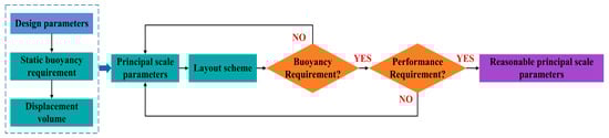 The selection of principal dimensional parameters for the innovative aquaculture platform adheres to the essential principle that the net buoyancy of the platform must balance its weight and the vertical loads from the mooring system. The selection process of the principal dimensions of the platform requires a comprehensive evaluation of their impact on the choice of internal structures, the overall layout, and the buoyancy state of the platform. Moreover, it is essential to evaluate the effects of the principal dimensional parameters of the main structure on hydrodynamic performance and construction costs. Figure 3 depicts the design workflow for the principal dimensions of the main structure of the proposed deep-sea aquaculture platform.