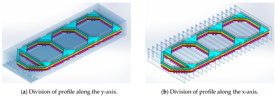 The platform is sectioned along the y-axis and x-axis, as illustrated in Figure 5. Given the large open slender body structure of the platform, it is likely to experience significant vertical shear forces, vertical bending moments, and torsion under wave action. These loads serve as the basis for selecting characteristic load conditions. The response values of characteristic loads at various transverse and longitudinal sectional positions are calculated to identify the maximum characteristic load and its location to establish the characteristic load response condition. It thus enables an accurate assessment of the structural strength of the platform. This method effectively resolves the issues associated with the poor universality and low accuracy of traditional characteristic load selection methods for new structures, which offers a reference framework for selecting wave load conditions for innovative structural forms.