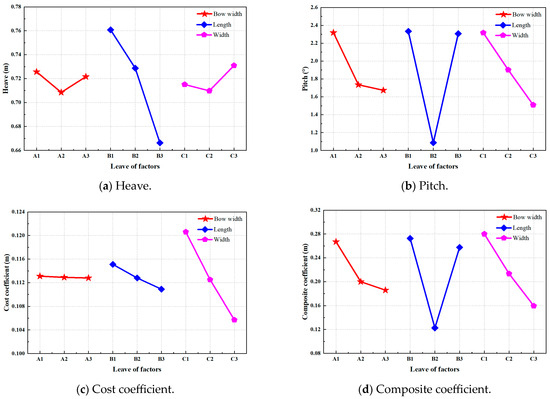 Table 6 details the results based on the range analysis method. Figure 10a–c depict the variations in heave amplitude, pitch angle, and cost coefficient in response to changes in the experimental factors.