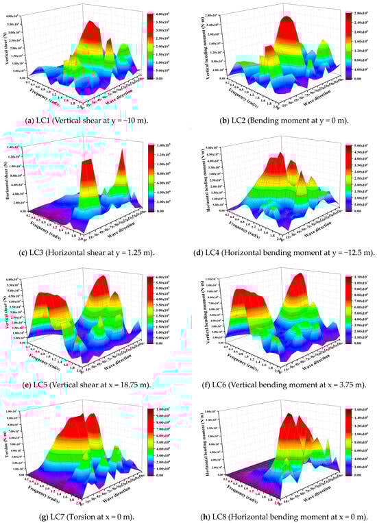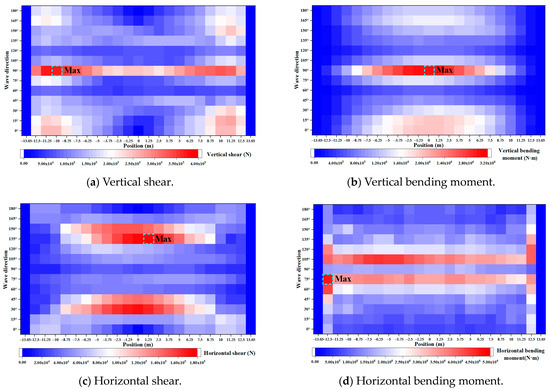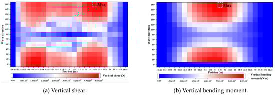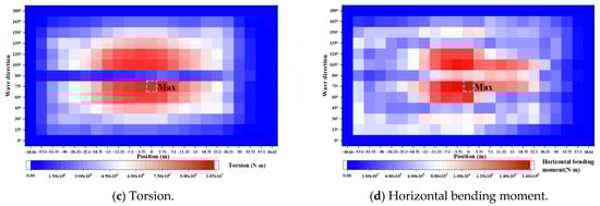 From Figure 11, the maximum vertical shear response appears at the section at y = −10 m, with a corresponding wave direction of 90 degrees (beam waves). The maximum vertical bending moment is observed at the section at y = 0 m, also with a wave direction of 90 degrees (beam waves). The maximum horizontal shear response occurs at y = 1.25 m, with the wave direction of 135 degrees (oblique waves). The maximum horizontal bending moment is observed at y = −12.5 m, with the wave direction of 75 degrees (oblique waves).