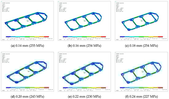To verify the quality of the finite element model’s mesh division, a parameter sensitivity analysis was conducted using six mesh models with sizes of 0.14 mm, 0.16 mm, 0.18 mm, 0.20 mm, 0.22 mm, and 0.24 mm, as shown in Figure 14. As illustrated in Figure 14, the overall stress distribution of the platform remains essentially unchanged across different mesh sizes. The maximum Von Mises stress value increases gradually as the mesh size decreases and eventually stabilizes. Considering both the number of elements and the computational results, a mesh size of 0.2 mm was selected for the finite element model of the platform to perform subsequent yield strength verification.