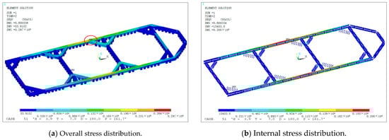 As observed in Figure 15, the overall stress distribution within the main structural frame of the platform is uniformly moderate, except for pronounced high-stress areas at the connections between the diagonal braces and the main frame. This high stress is attributed to potential local deformations at these junctions, which cause internal stress redistribution to form high-stress concentrations at the corners. Additionally, due to the influence of wave loads, these regions of junction connection may be subjected to uneven load distributions, which compound the complexity of loads at the connection corners and exacerbate stress concentrations.