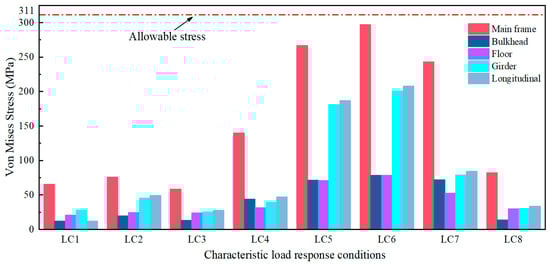 As illustrated in Figure 16, the Stress variations under different conditions exhibit a consistent trend across components of the platform, with the main frame enduring the highest Von Mises stress. The design scheme of the platform is characterized by the large-opening, slender, vessel-shaped main structure, which inherently leads to lower resistance to bending moment and torsion. Under extreme environmental loads, the primary longitudinal components such as the girder and longitudinal must endure considerable axial pressure, bending moments, or shear forces to maintain structural stability, leading to elevated Von Mises stress levels in these elements. The yield strength verification of the platform structure revealed that the Von Mises stresses in components such as the main frame, bulkhead, floor, girder, longitudinal, and float shell all remain below the allowable stress values as specified in the Rules for the Classification of Offshore Mobile Platforms by the CCS. Consequently, it is affirmed that the structural strength of all components of the proposed aquaculture platform adheres to regulatory standards.