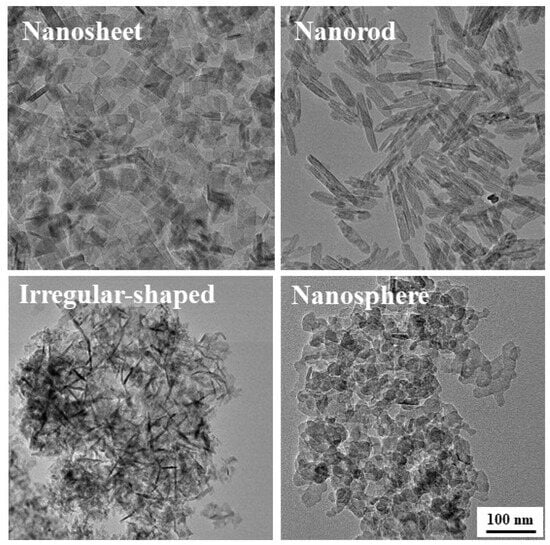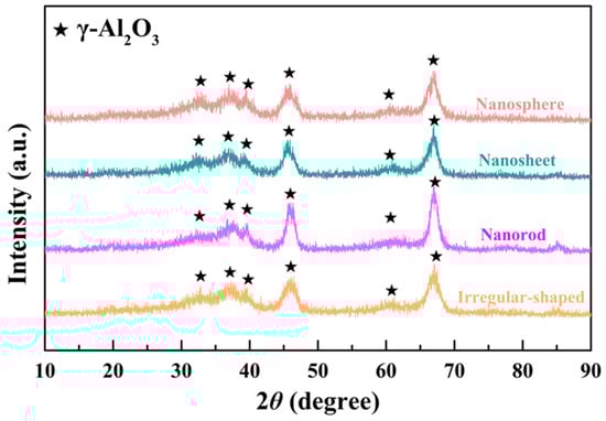 The XRD pattern of the γ-Al2O3 nanoparticles with different shapes is shown in Figure 3. The strong diffraction peaks appearing at 2θ = 31.4, 37.7, 39.3, 45.5, 60.3, and 66.8° corresponded to (220), (311), (222), (400), (511), and (440) crystal planes of the face-centered cubic (fcc) structure of γ-Al2O3, which are in good agreement with the common JCPDS (card NO. 10-0425) and no impurity peaks are observed [20,21]. The peak intensities of all samples exhibit remarkable similarity, thereby confirming their analogous crystalline nature. The XRD analysis demonstrated that the four differently shaped samples contain 100% γ-Al2O3.