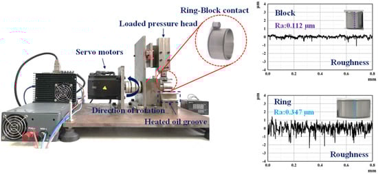 Block-on-ring tests were conducted to study the tribological properties of the lubricating oil with Al2O3 nanoparticle additives. The testing configuration of the block−on−ring wear test machine is shown in Figure 4. The block was held in a special collet inside a pressure head. The ring was immersed in the lubricating oil, and rotated by a Servo motor. The contact form of the block and ring specimen in the tester is line contact. The block and ring materials were both GCr15, and the hardness was approximately 1433.7 HV0.1 and 1169 HV0.1, respectively. The ring has dimensions of Φ50 mm × 25 mm, while the block is smaller with dimensions of Φ10 mm ×10 mm. The surface roughness, Ra, of the block and ring was about 0.11 and 0.35 μm, respectively. Details regarding the operating conditions during the experiment are presented in Table 1. The block and ring specimens were ultrasonically cleaned in petrol and alcohol for around 20 min before and after the test.