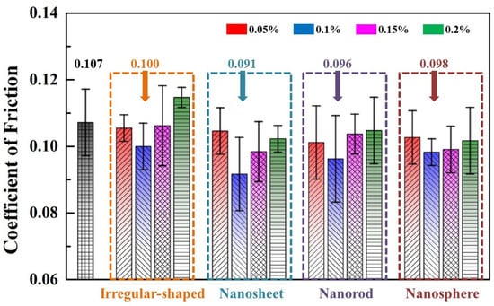 Friction coefficient of Al2O3 additives with different shapes at different concentrations.