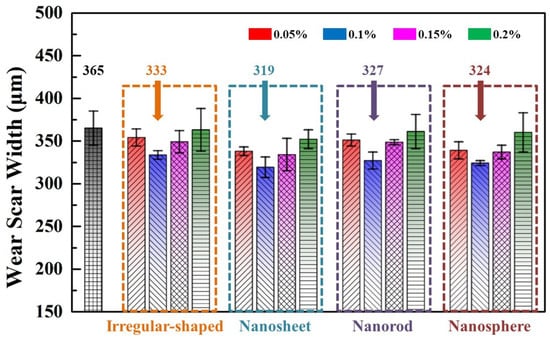 Figure 6 shows the wear scar width after the wear tests using the different lubricants. The wear scar width was smaller with the addition of Al2O3 nanoparticle additives than that when using the base oil. When the concentration was 0.1%, the wear scar width was at its minimum for all four types of nanoparticles. The wear scar width with the addition of Al2O3 nanosheets was the smallest at 319 μm on average and 12.6% less than that of using the base oil.