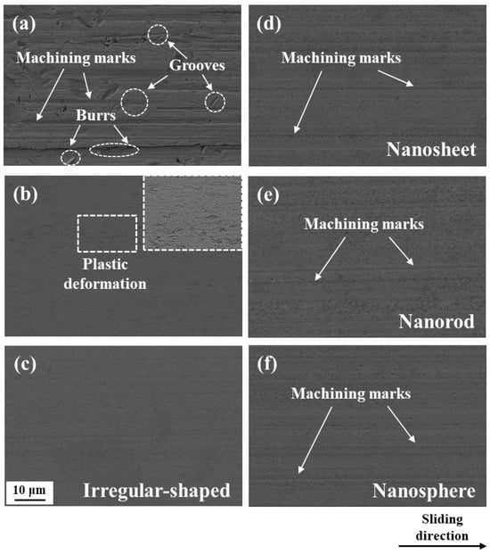 Figure 7 presents SEM micrographs of the block surfaces before and after the wear tests using the different lubricants. Figure 7a depicts the block surface before the wear test and the original cutting texture can be seen on the surface. In addition, some tiny grooves and burrs can be found on the original surface. Figure 7b shows the wear result using base oil: it can be seen that relatively severe wear occurred, leading to the almost complete disappearance of the original cutting marks. Plastic deformation along the sliding direction and the existence of some grooves can be seen on the worn surface. When the irregular-shaped nanoparticles were used as lubricating additives, slight original cutting marks were observed compared to under base oil conditions (Figure 7c), which means a milder wear occurred. However, under the nanosheet, nanorod, and nanosphere additive lubrication (Figure 7d–f), it can be seen that the original machining marks were largely retained on the block wear surface. This indicates the effective anti-friction and anti-wear properties offered by these different additive-based lubricants. Al2O3 nanoparticles move into worn areas and are physically adsorbed on the contact surface under the exerted compressive stress and the flow of lubricating oil. At this time, the addition of nanoparticles reduces direct contact between the friction pairs, and the presence of spheres and rods transforms the pure sliding friction into mixed sliding–rolling friction [23]. The Al2O3 nanosheets can be adsorbed onto the friction surfaces, resulting in easy sliding.