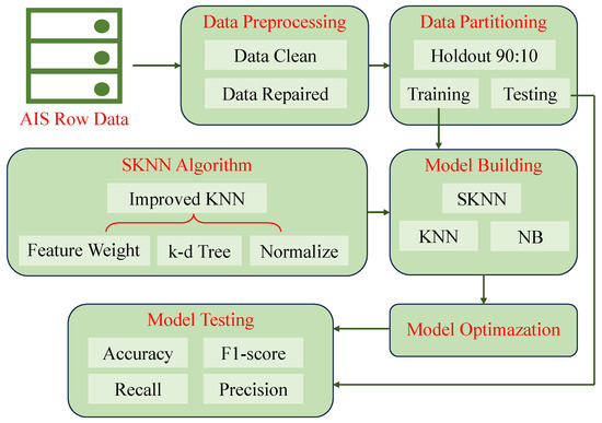 In our method, the labels are regarded as the prediction results, and the sub-trajectories of all ships are taken as samples. Then, the k sub-trajectories with the closest distance to the current ship’s trajectory data are found, and the labels of these k sub-trajectories are counted, and the highest number of labels is the final prediction result. The conventional KNN algorithm assigns equal weights to the labels of all k sub-trajectories, i.e., the weights of all the neighboring points are equal. However, in instances of sample imbalance, where one class has a significantly larger number of samples compared to others, there is a high probability that the classification model will be skewed towards the majority class. This bias can lead to misclassification errors for test samples that belong to the minority classes. For this reason, this paper uses the method of weights to improve this problem. By using the reciprocal of the distance as the weight of the label, the neighbors with a small distance from the sample have large weights, while the neighbors with a large distance from the sample have relatively small weights; thus, the factor of distance is also taken into account to avoid misclassification due to too large a sample.