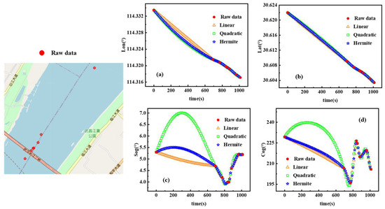 Figure 5 shows the restoration results of longitude (lon), latitude (lat), velocity (SOG), and heading (COG). Figure 5a shows that the three interpolation methods have comparable longitude restoration effects when the data are missing at short distances, while the secondary interpolation and segmented triple Hermite interpolation methods have closer restoration effects when the data are missing at long distances. Figure 5b shows that the latitude restoration results of the three interpolation methods are comparable at both long and short distances. Figure 5c,d show that the speed and heading fixes of the three interpolation methods are comparable in the case of missing data at short distances, while the secondary interpolation is poor in the case of missing data at long distances, and the linear interpolation and segmented three-time Hermite interpolation methods are close to each other. In summary, the three interpolation methods are comparable when the data are missing at short distances, the segmented three-times Hermite interpolation method is better when the data are missing at long distances, while the original trajectory characteristics are well maintained. Therefore, this paper selects the segmented three-times Hermite interpolation method to repair the trajectory.